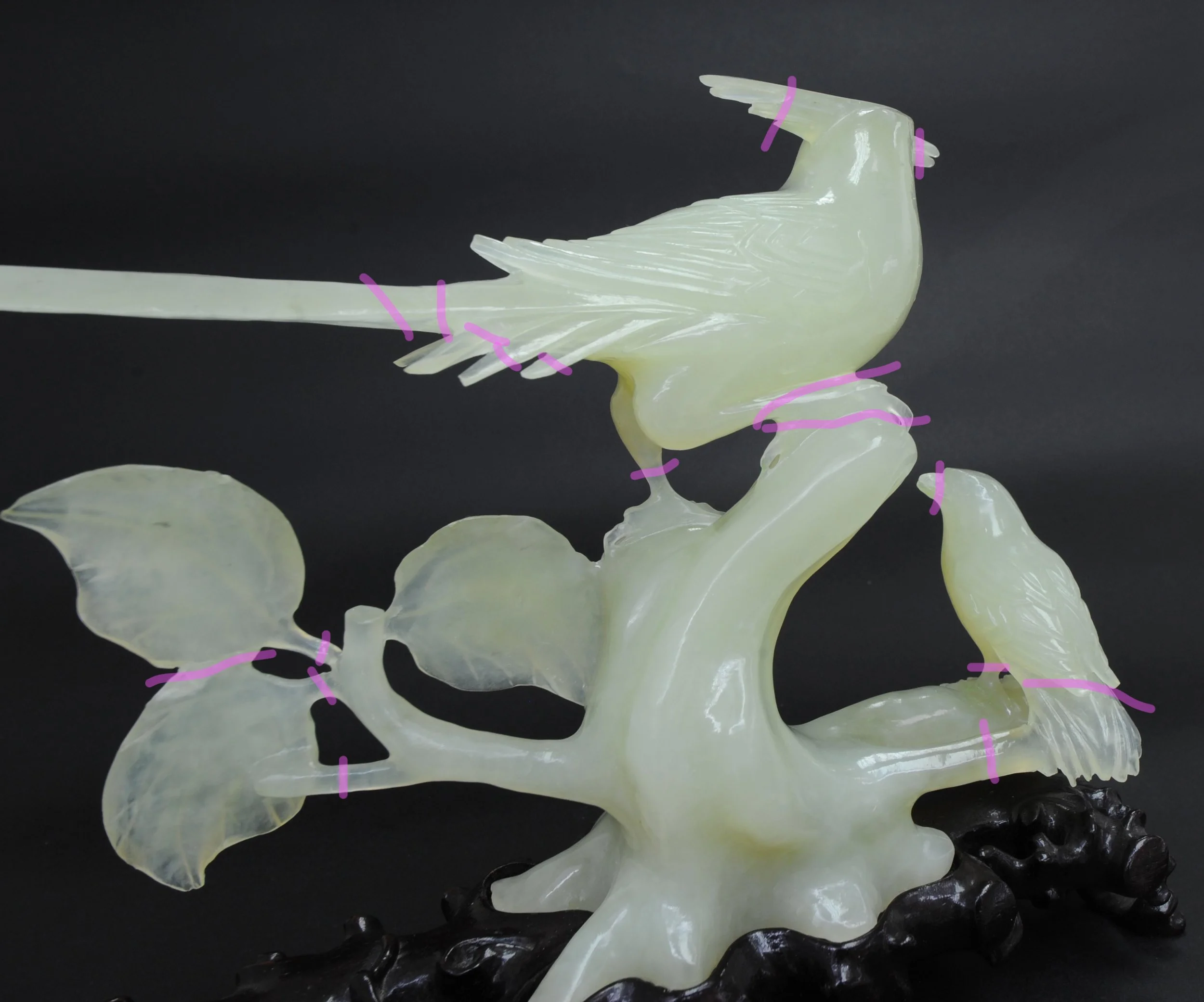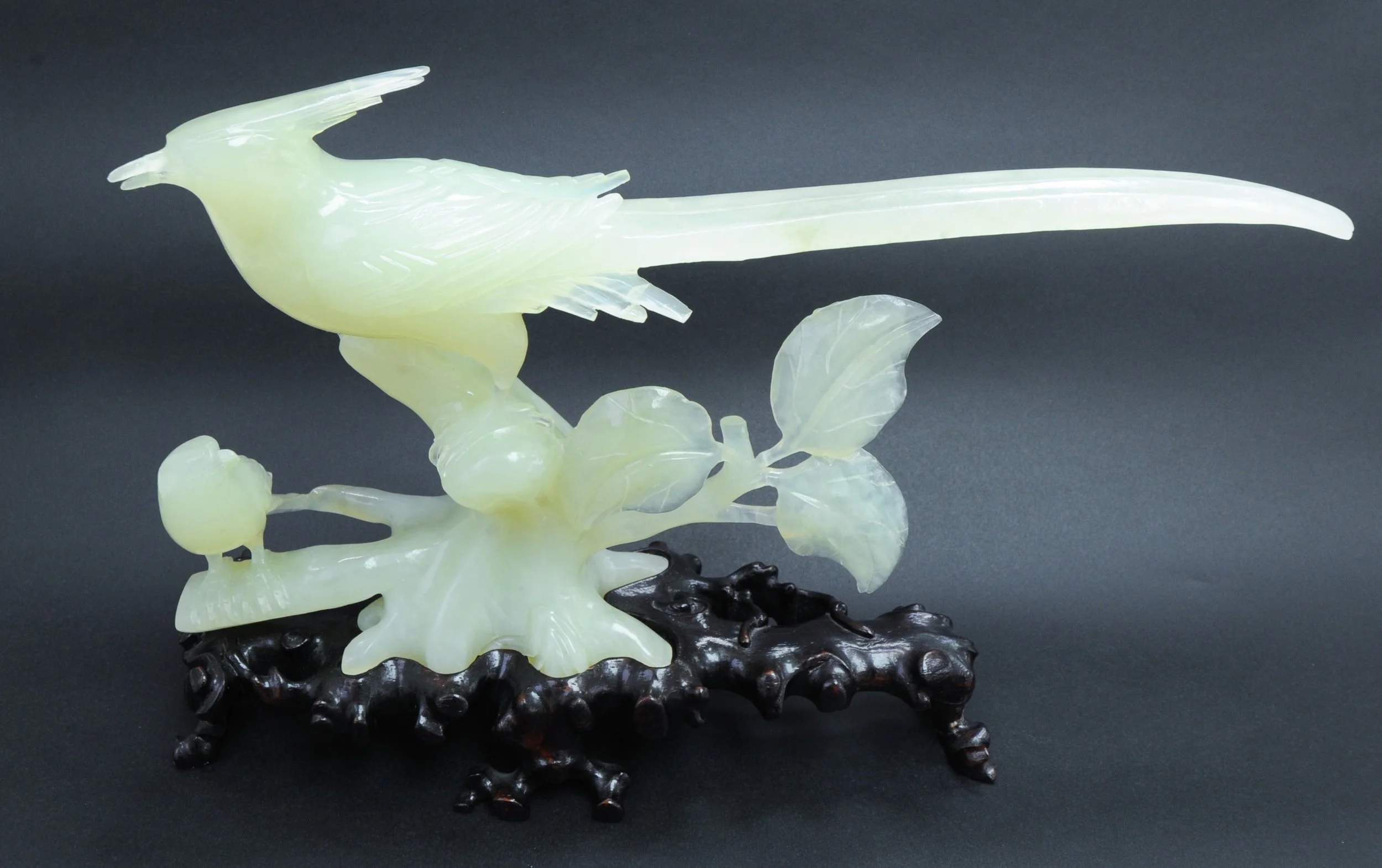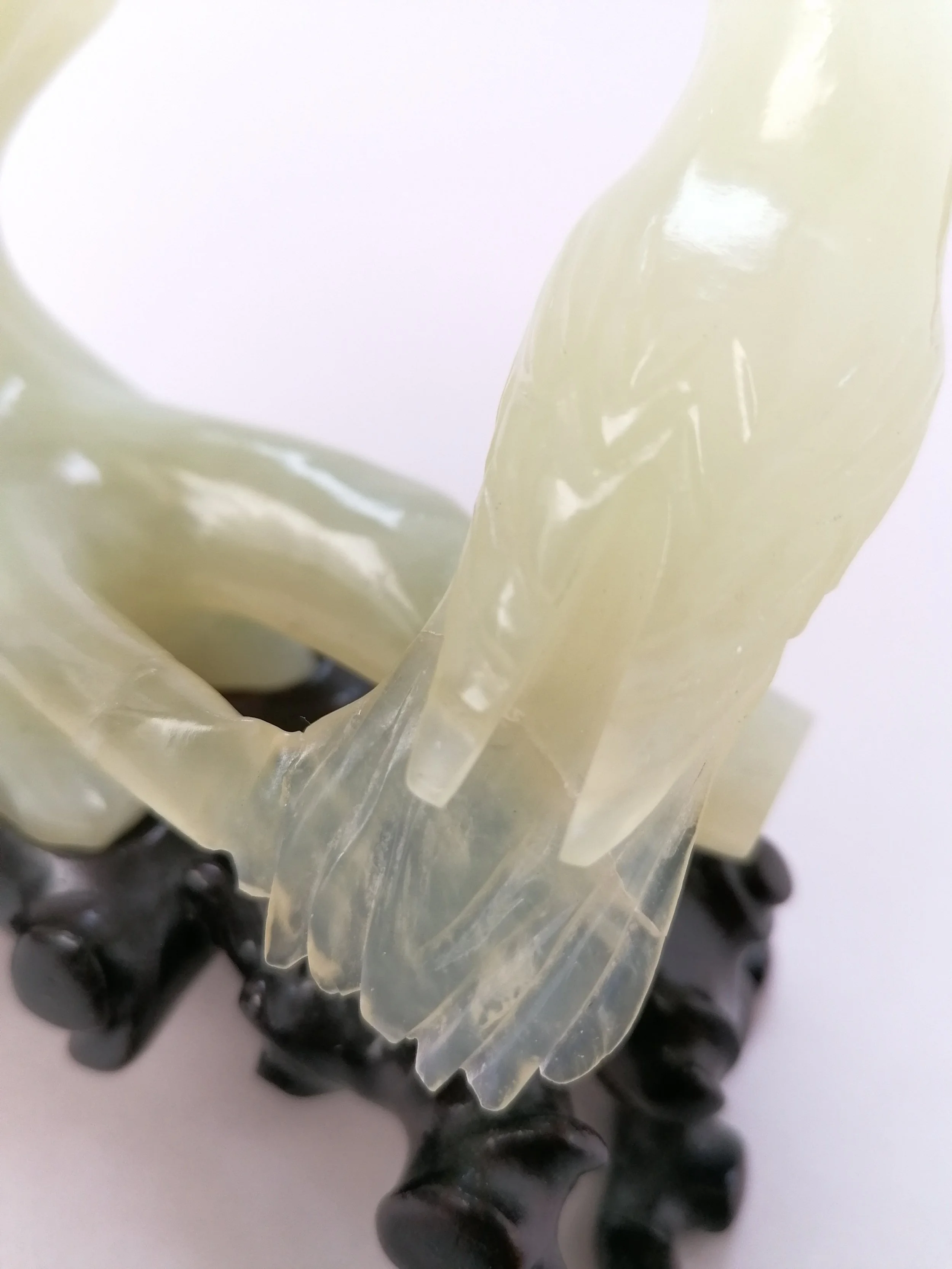 The sculpture is depicting two birds, possibly a golden pheasant and a finch, on a leafed branch and is finely carved and well balanced. The object was received with an east Asian style textile covered and lined box with a cushion to fit the sculpture as well as the lacquered wooden stand which the jade bird is meant to be displayed upon. A paper label on the box translates from traditional Chinese to say “Jade Bird Storage”. The stone is vulnerable to scratching, which was deduced from the known methods of fabrication (carving, chiselling, and filing) and varies in translucency and colour throughout. Some small cloudy inclusions, small flecks of dark green, and natural internal texture of the stone can be observed throughout the object. The colour ranges from nearly water white, pale green, creamy white, to faintly yellow-green.