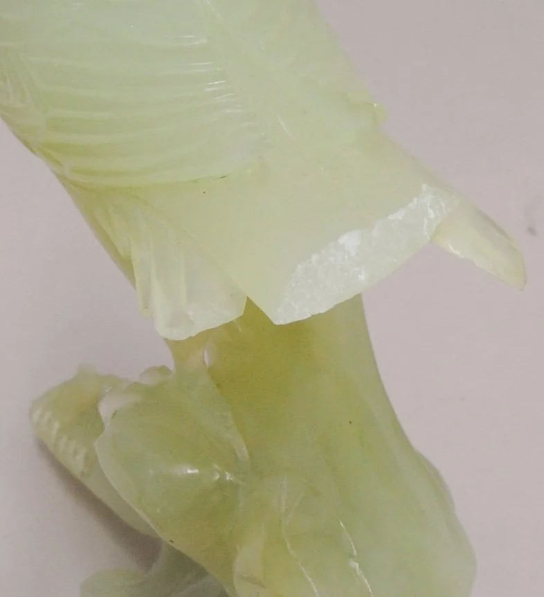 The sculpture is made of a jade material. Jade is a term applied most commonly to jadeite and nephrite, though is sometimes also used to describe serpentine varieties like bowenite. Nephrite, jadeite, and serpentine are hard silicate based materials. The green/yellow-green colour of each stone is due to trace elements, jadeite commonly coloured with Iron, nephrite with magnesium and iron, and serpentine with magnesium and nickel (Arem, Ph.D, FGA, n.d ; Jiang et al., 2020). Upon visual analysis, this sculpture seems to be made from “new jade” variety serpentine, jadeite, or light apple green nephrite (Arem, Ph.D, FGA, n.d.). Although possible to identify the specific mineral an X-ray Fluorescence (XRF) spectroscopy would be required, which was determined to be beyond the scope of the treatment needs of this object.