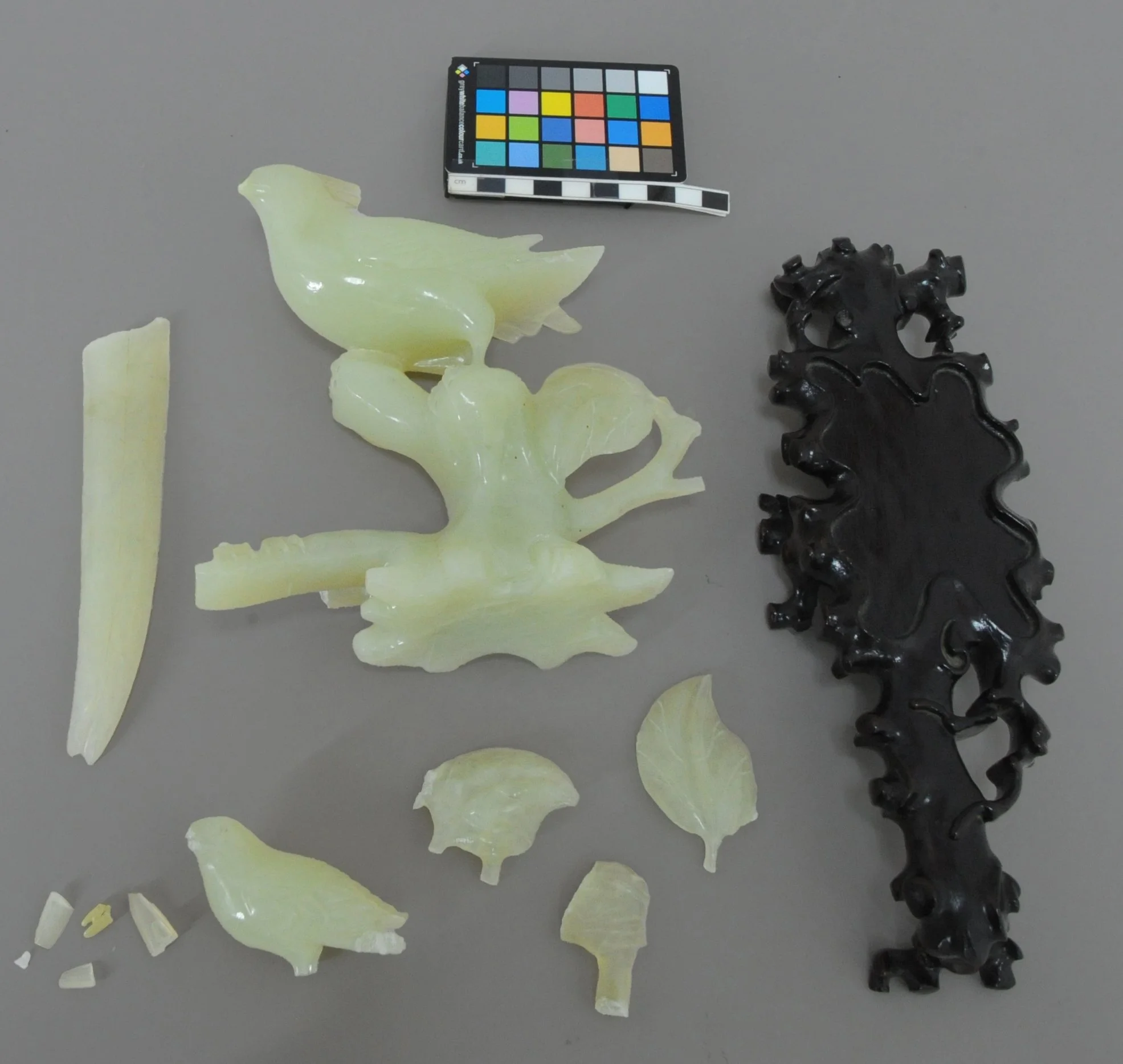 After considering the porous nature of the jade stone, research was done to identify potential adhesives which would be most appropriate. This included reading articles on the treatment of similar objects, carrying out basic tests on semi-porous stone samples, and consulting an expert who has extensive experience working with semi-porous stone. The acrylic resin Paraloid B-72 (Ethyl methacrylate co-polymer) strengthened by the addition of fumed silica, and gelled Hxtal (Epoxy resin) were chosen. Paraloid B-72 was used on all low-weight baring bonds, and Hxtal on the bond between the tail and main body fragments. This was done because although gelled Hxtal would be less likely to migrate into the microscopic veins of the stone than when it is freshly mixed with a low viscosity, epoxy is far stronger of a material than jade. This was demonstrated by the most recent breaks occurring on the original fabric of the object, and not where the object had been previously broken and bonded. The exception of this was where the beak had been adhered, though it might have been a removable fill bonded with something akin to Paraloid B-72, thus demonstrating the weaker bond of those types of adhesive. An ideal adhesive is strong enough to support the weight of the object but would break before the original material in the case of another damage event. Paraloid B-72 fits this requirement but might have been too weak of a bond at the tail break, which is why Hxtal was used for this bond. Hxtal had to be partially set, so that it was more viscous lest run the risk of flowing into the natural micro-vein structure of the stone and away from the bond area, which would have resulted in a weak join and an irreversible impregnation of the stone by resin. This could have resulted in darkening of the stone material around the bonded area, which would have been undesirable.