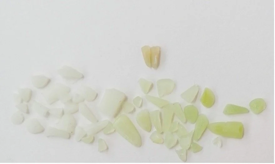 Fig.4- Pictured here are all the fill color variations I experiemented with, though they appear opaque as they have not yet been polished. I used semi-cured templates and cut them to the precise shape and size, necessitating a final gloss layer to expose the transparency beneath the rough surface. The top yellow fill is one made about 20 years past, when the object had been previously repaired using Fynebond epoxy. I chose to replace it with a new one due to the mismatch in color.