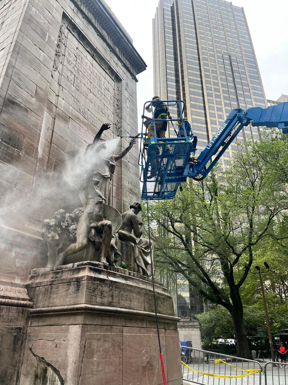 Figure. 3- Due to the scale of the project, we were all trained to drive and operate a boom lift to reach the figurative sculptures for accurate cleaning. The wet cleaning of the figurative elements of the monument occurred after repointing, and before any laser treatment.