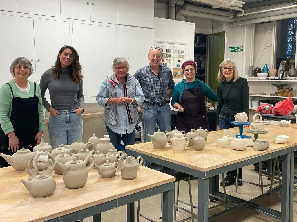 This 5 day Masters class was taught by studio potter Tim Andrews (fourth from the left), who has work exhibited in museums around the world, including the Victoria & Albert Museum in London. I threw 7 teapots(pictured in the front two rows on the left table) on the potters wheel by the end of this course, and had the pleasure of collaborating on an additional teapot with Tim Andrews himself.